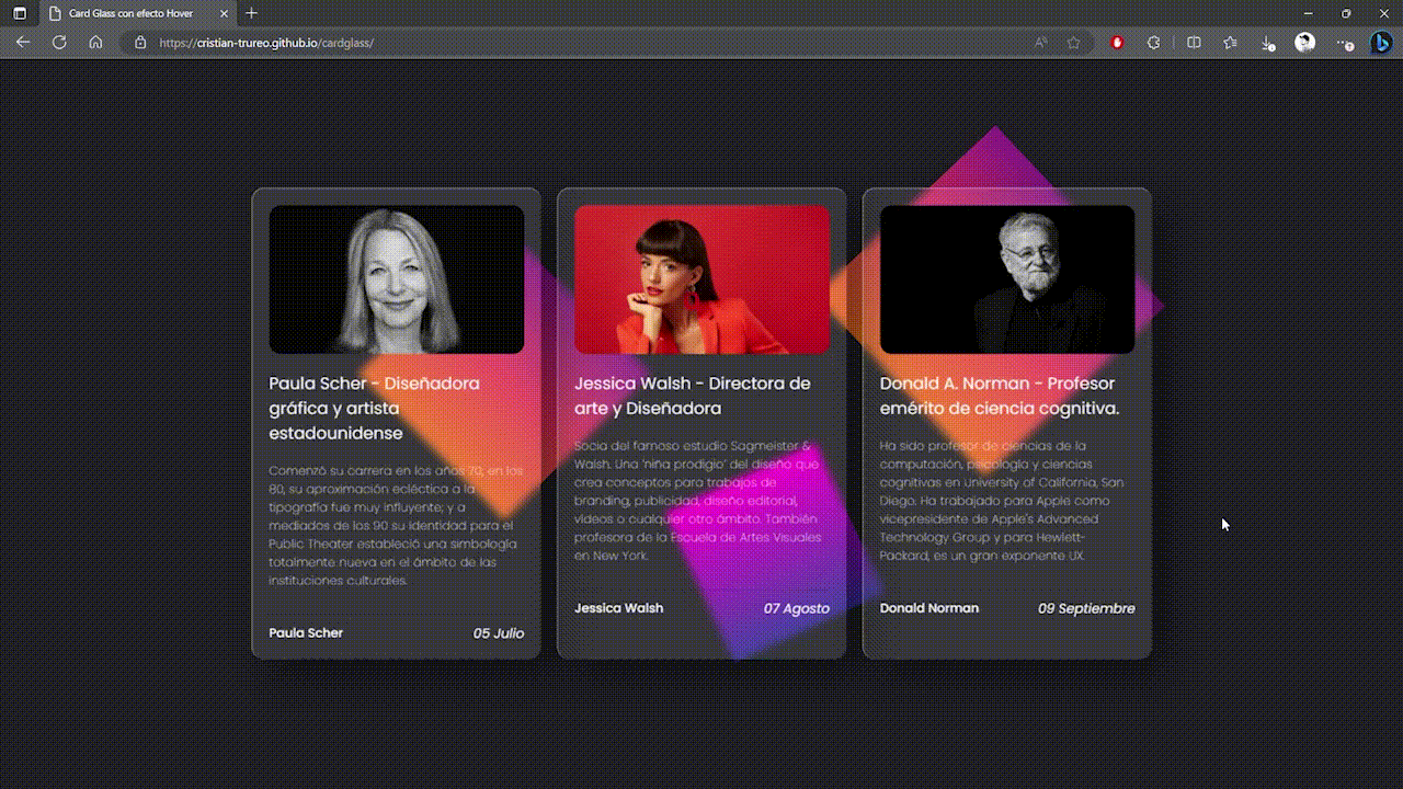 Creación de cards, componente típico en webs, para agrupar información o por ejemplo para mostrar productos dentro de un mismo elemento, se aplica efecto morfismo de vidrio y un fondo animado con CSS.