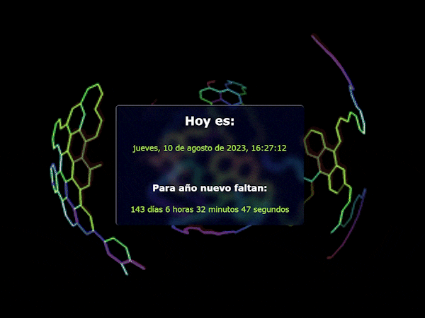 Uso de Javascript y Date, para mostrar la fecha y hora actual, además de los dias y horas restantes hasta el siguiente año nuevo, uso de manipulación de DOM, método Math y setInterval.